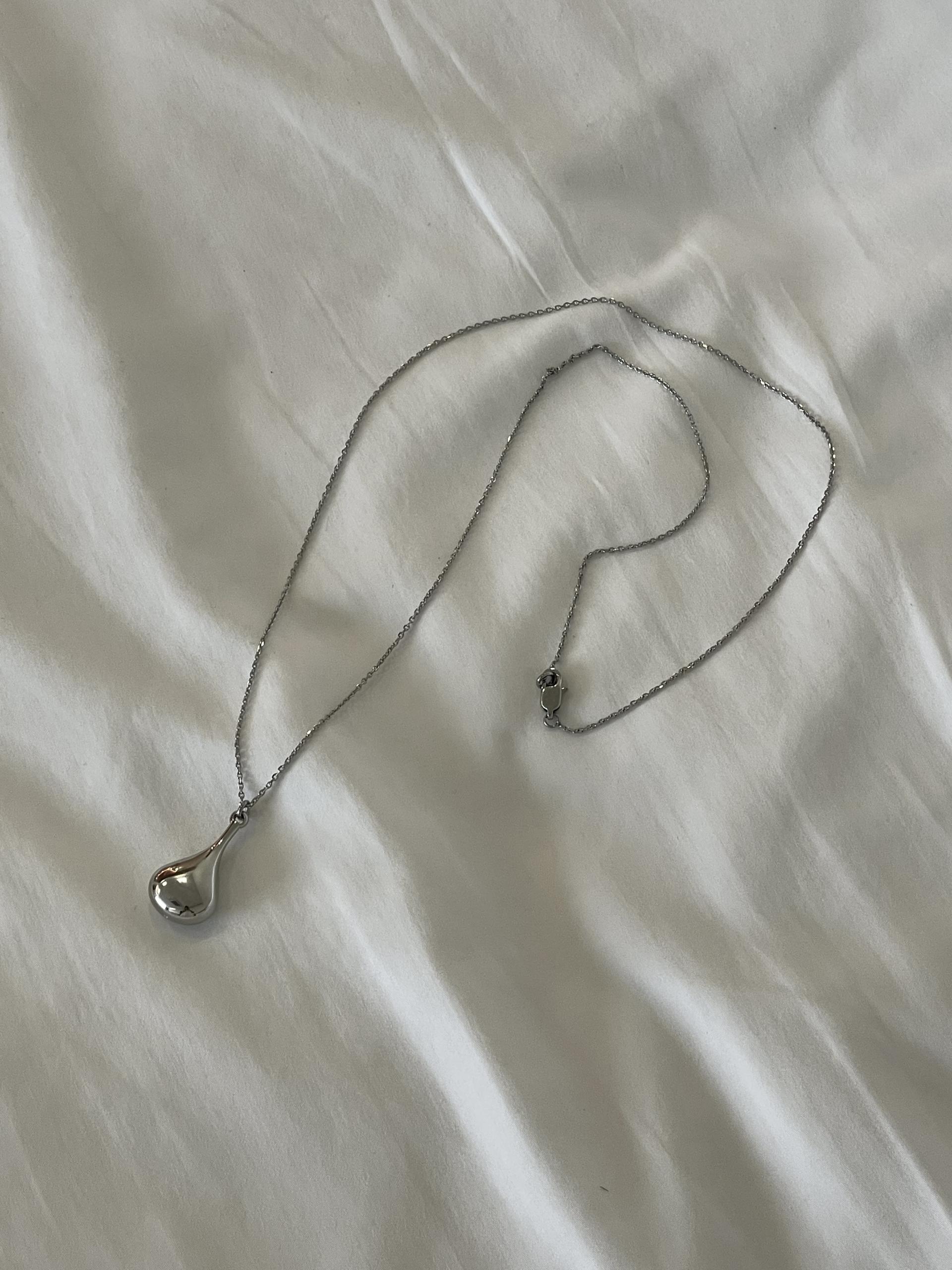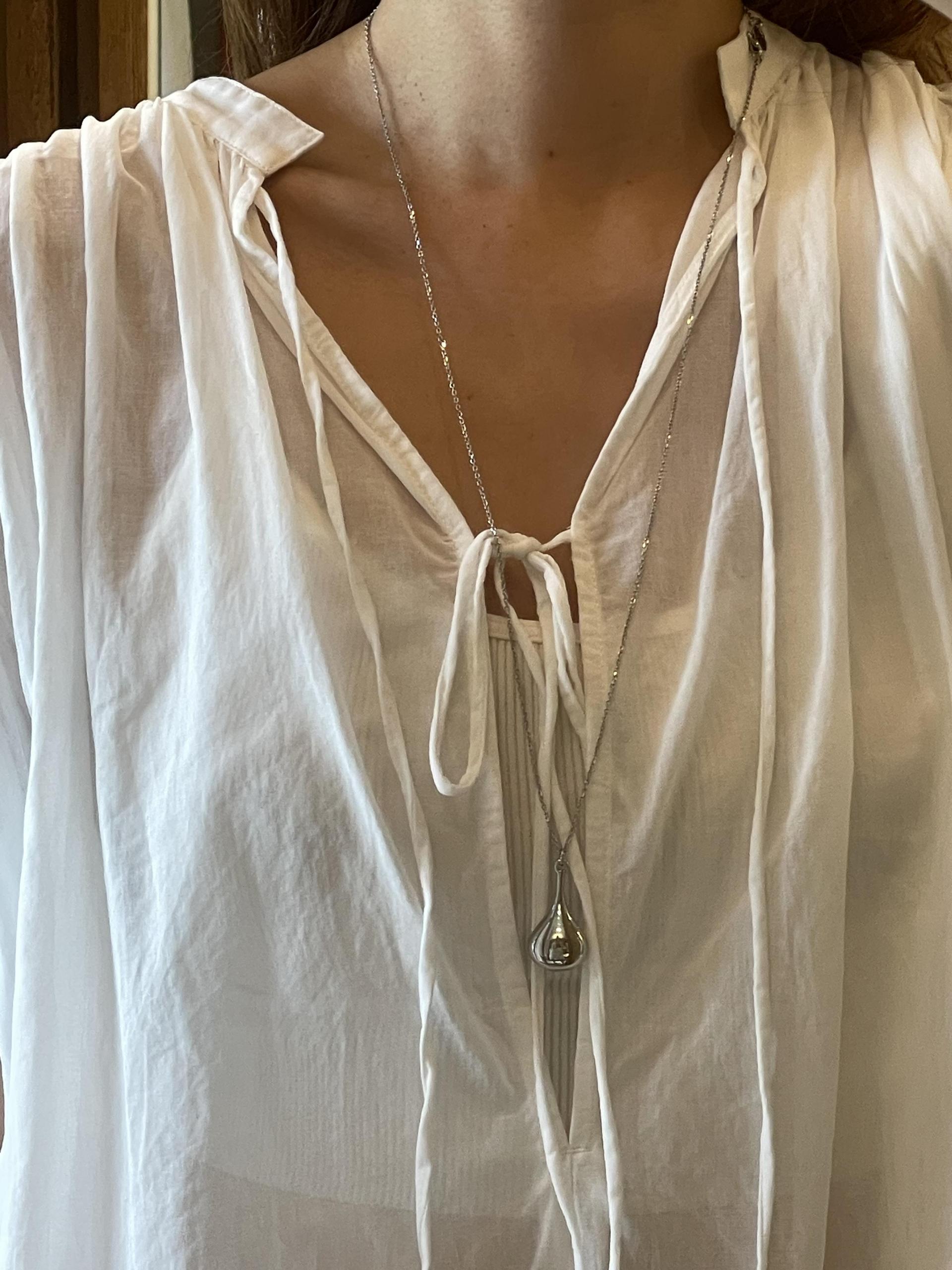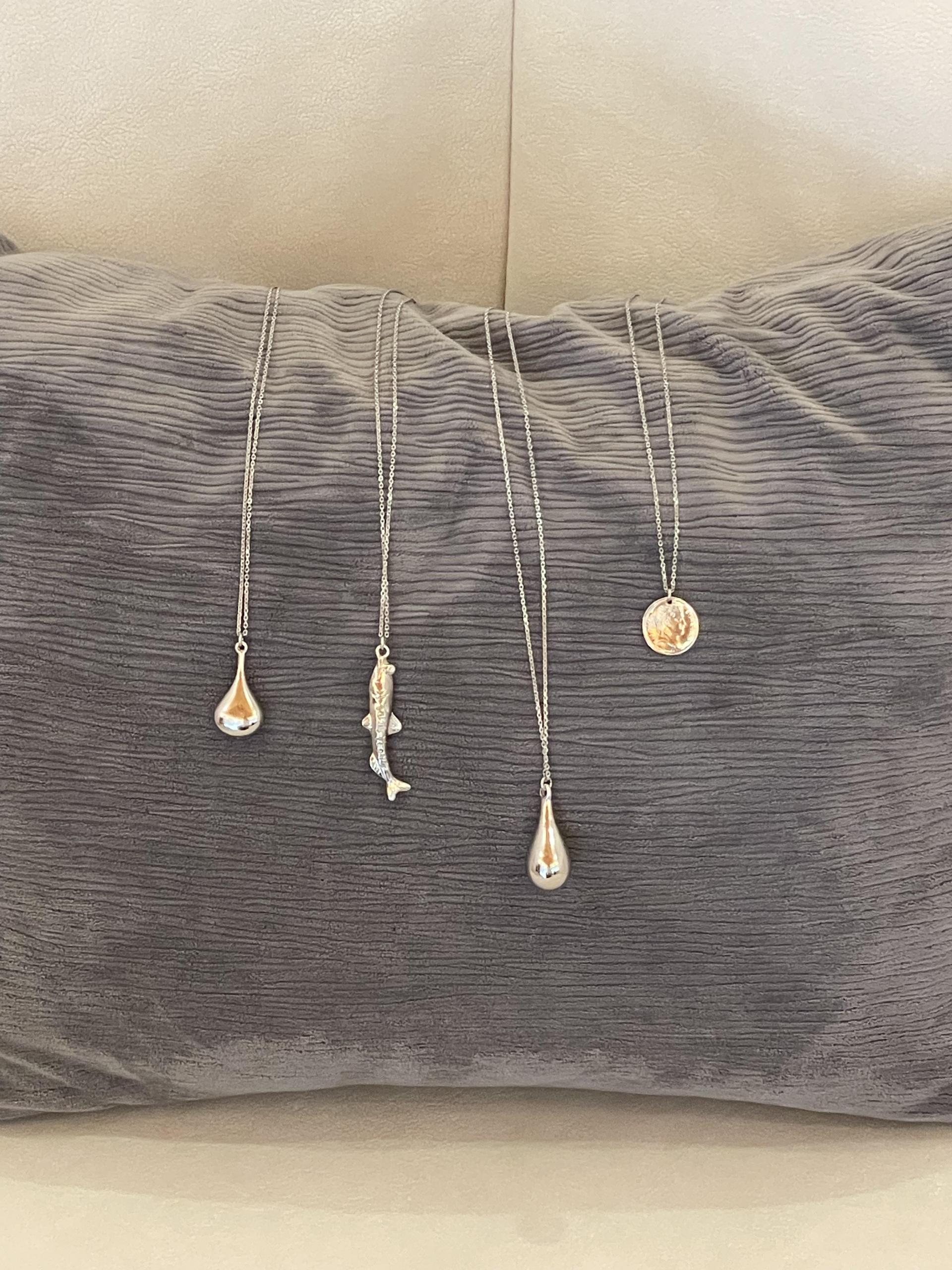 실버 베이스 모양을 닮은 볼드한 팬던트의 존재감이 스타일을 더 감각적으로 만들어드리며, 긴 기장감으로 어느 착장에나 쉽게 착용하기 좋은 디자인입니다.
