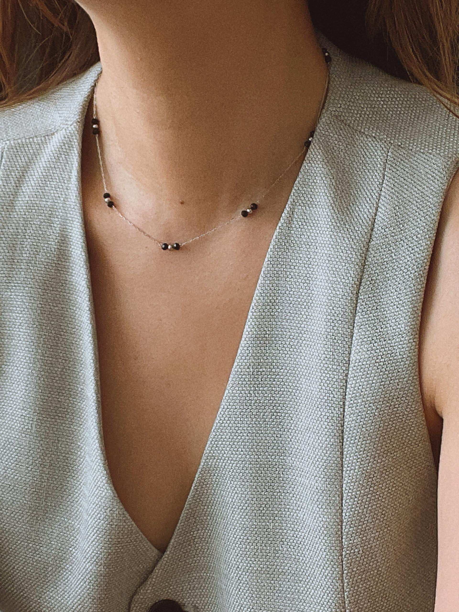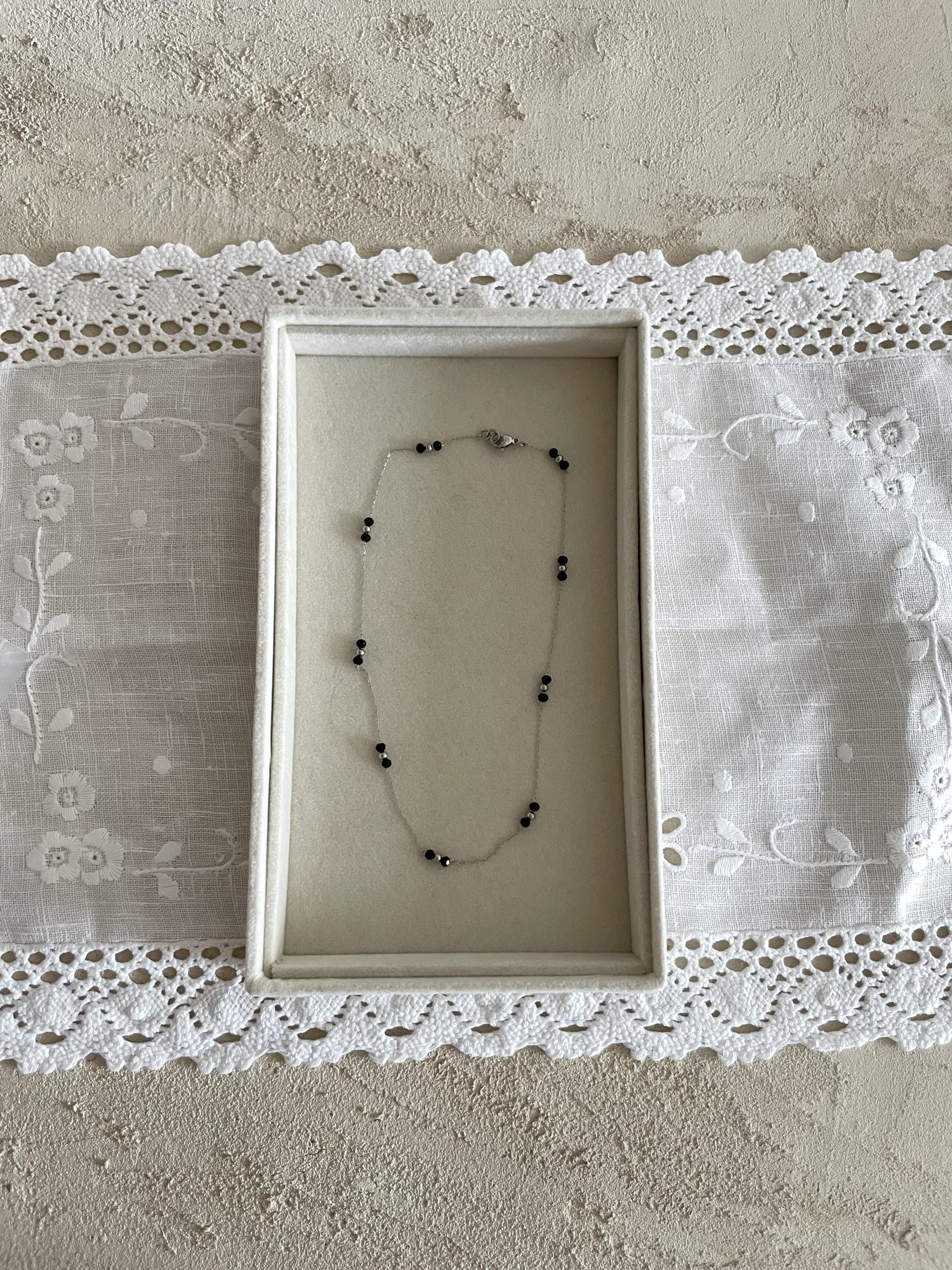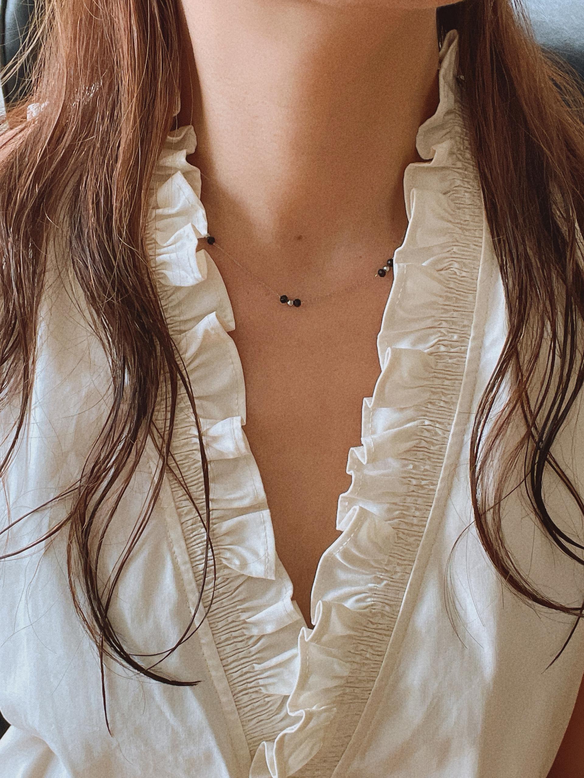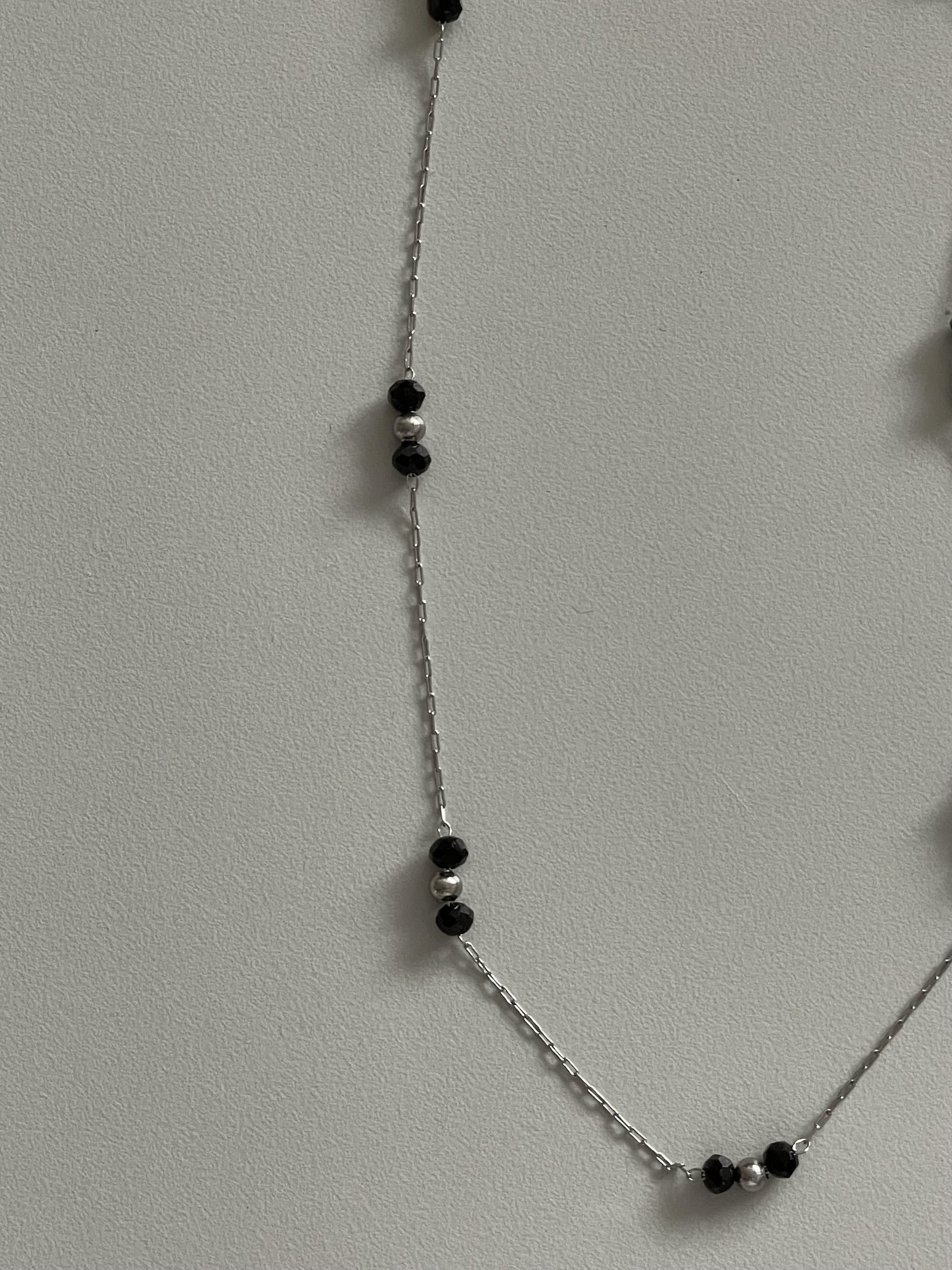 얇은 체인과 블랙 비즈의 레이어드가 넥선을 더 가늘고