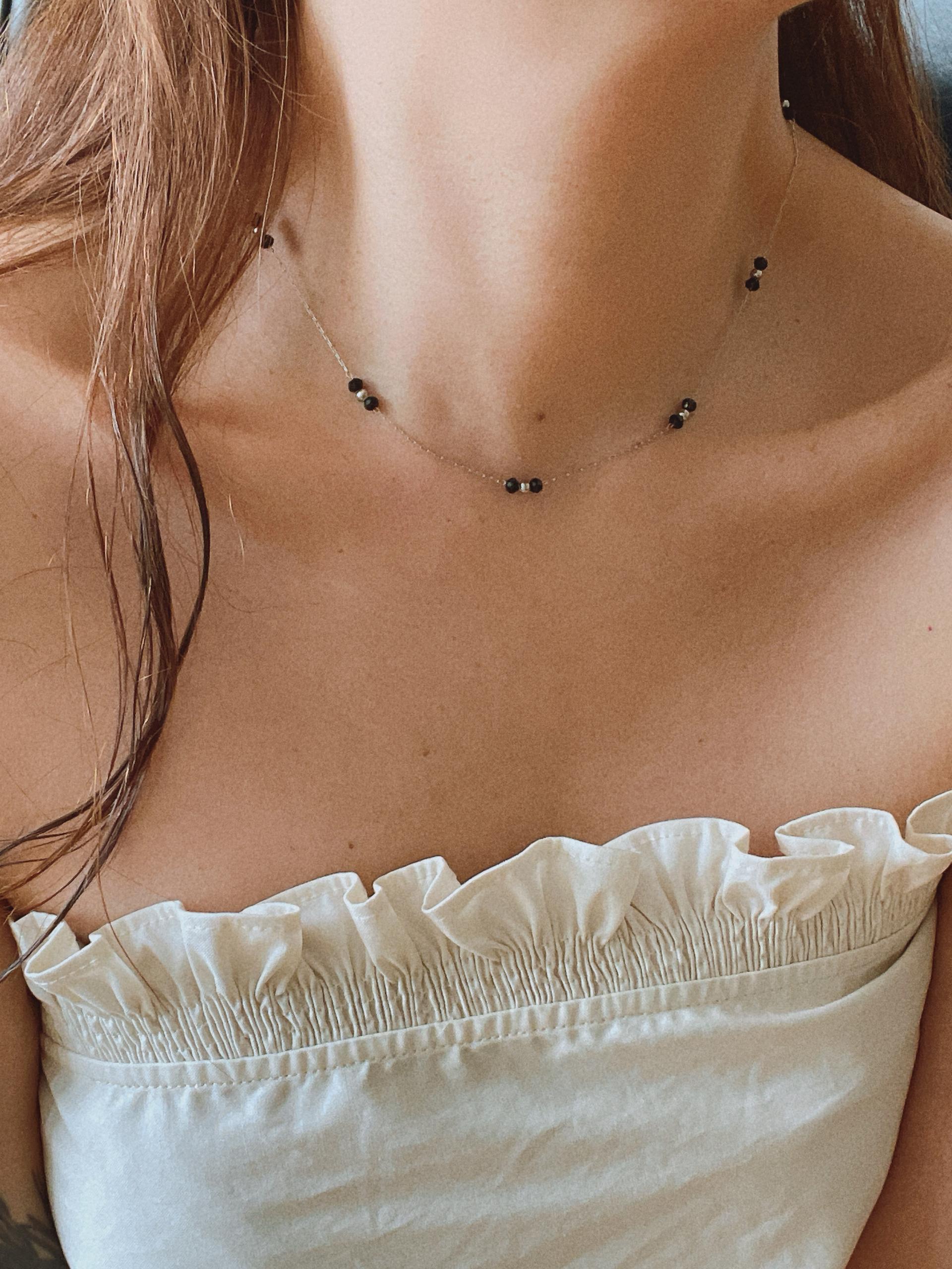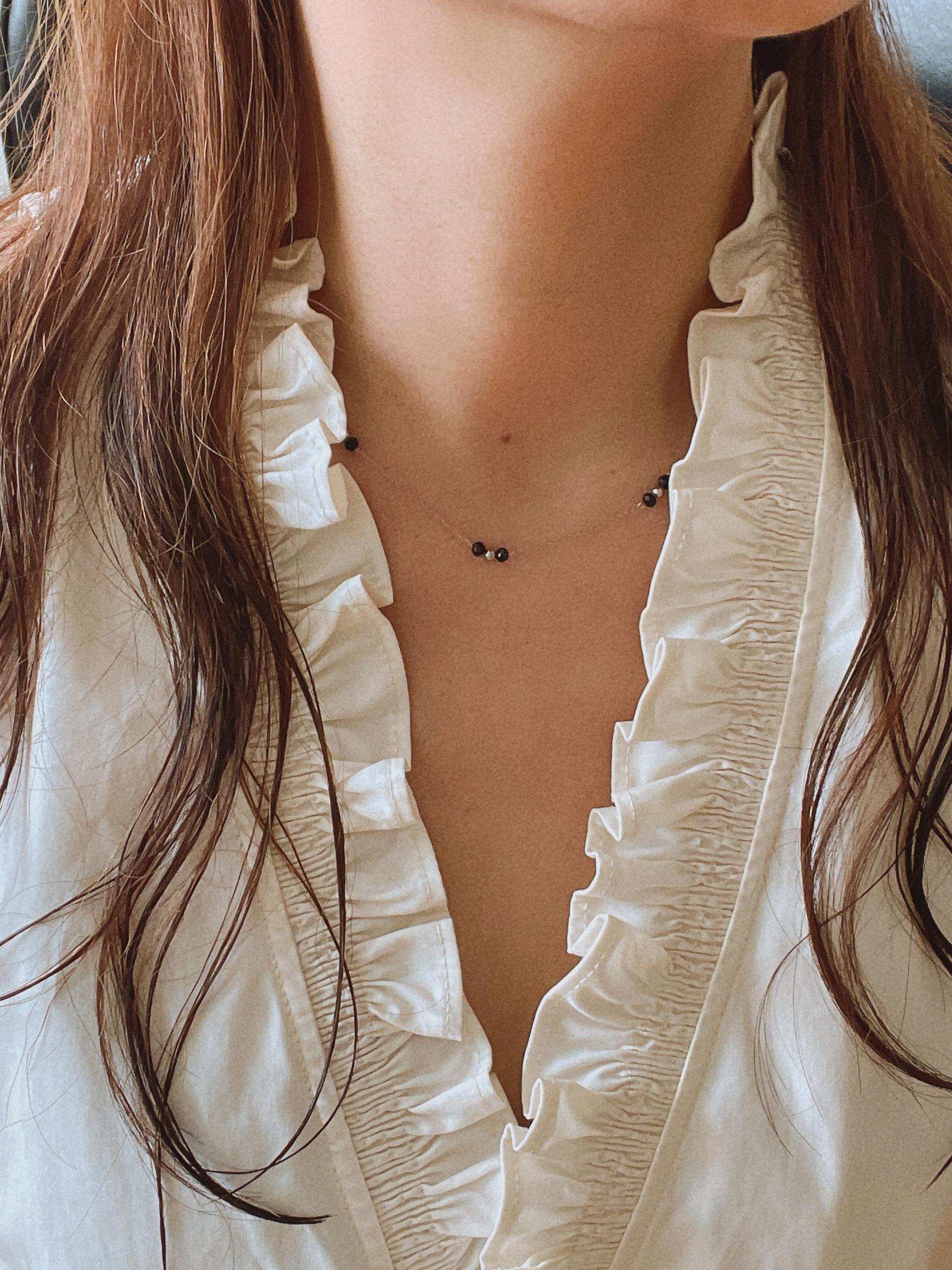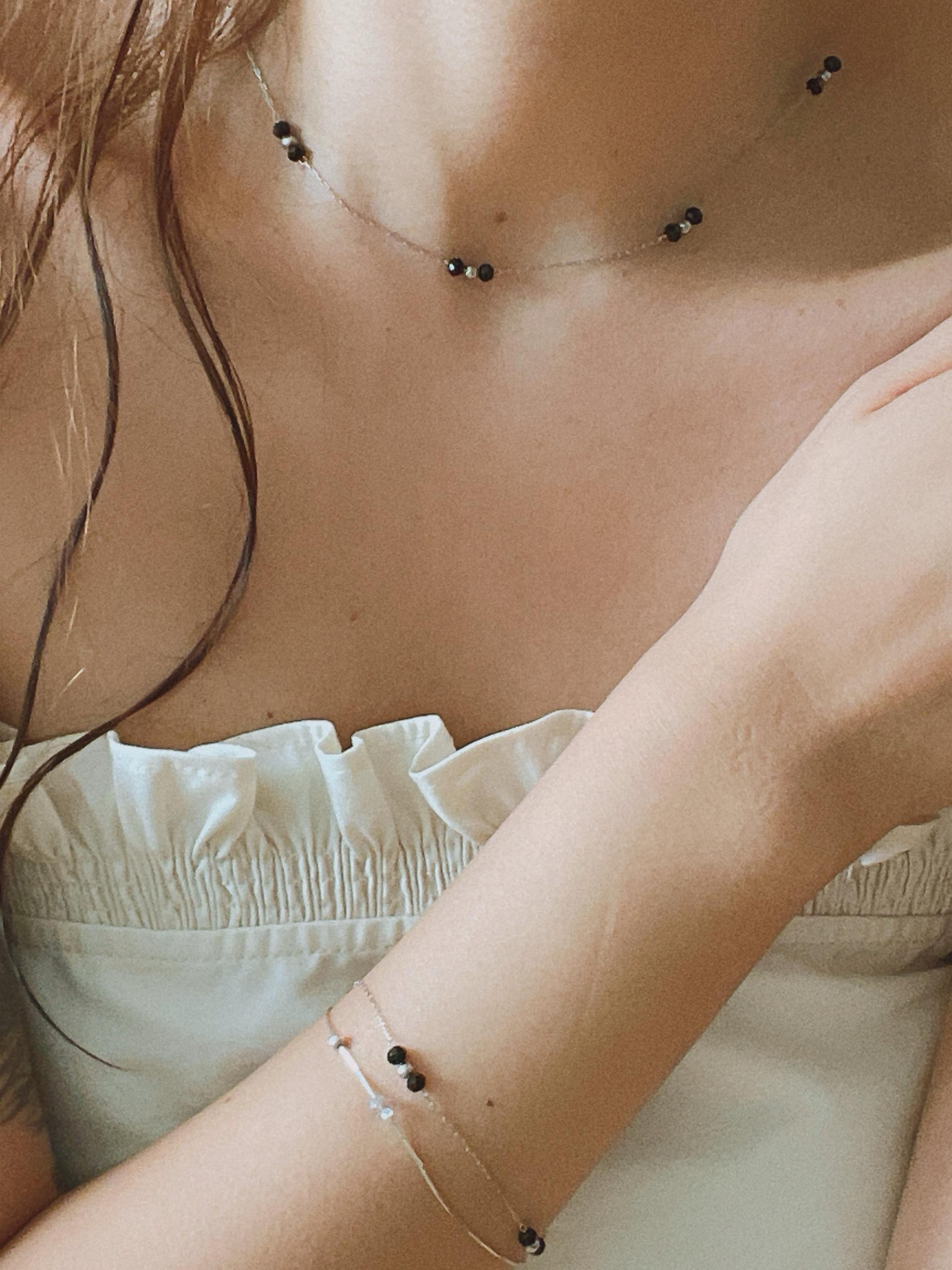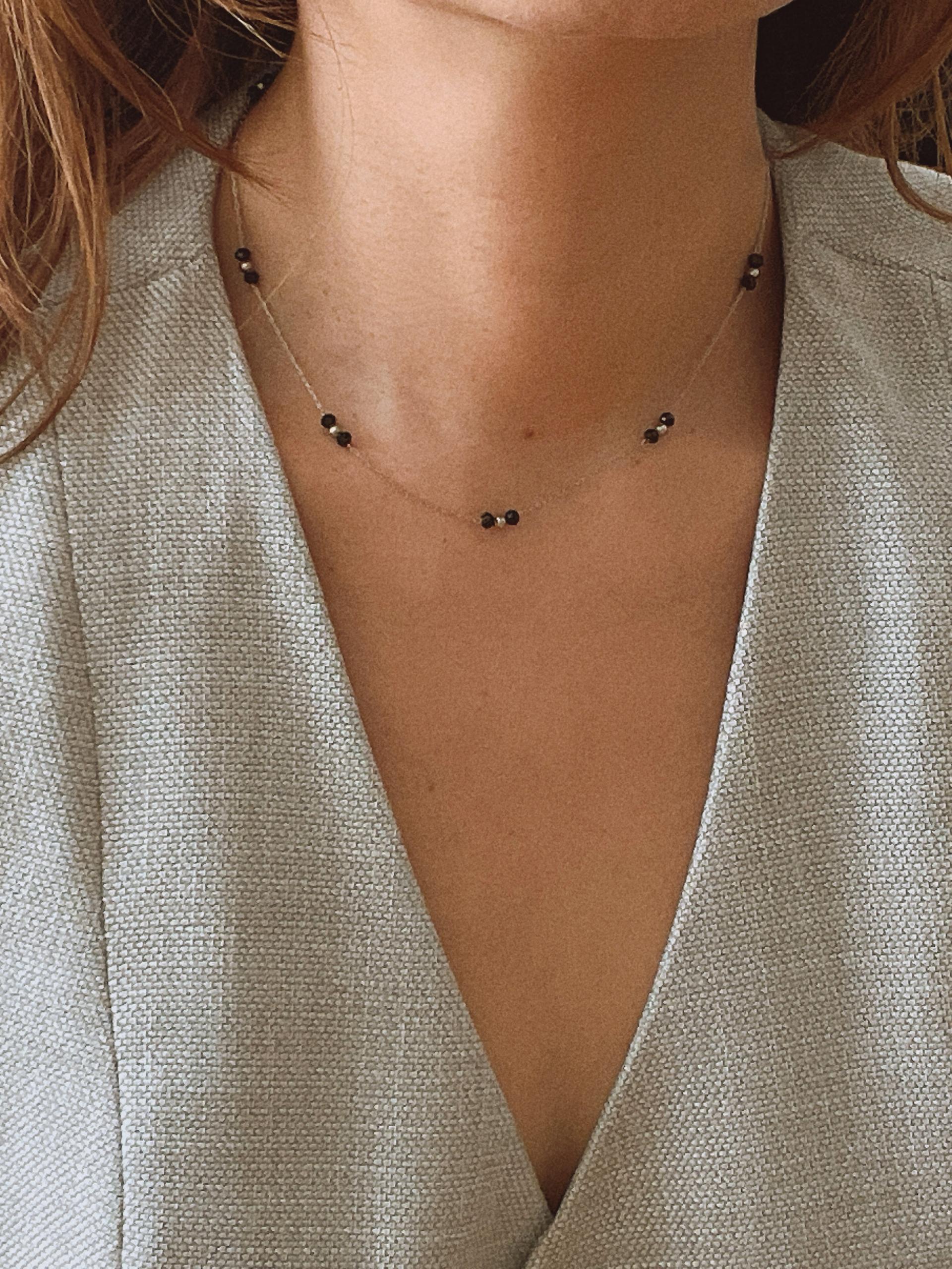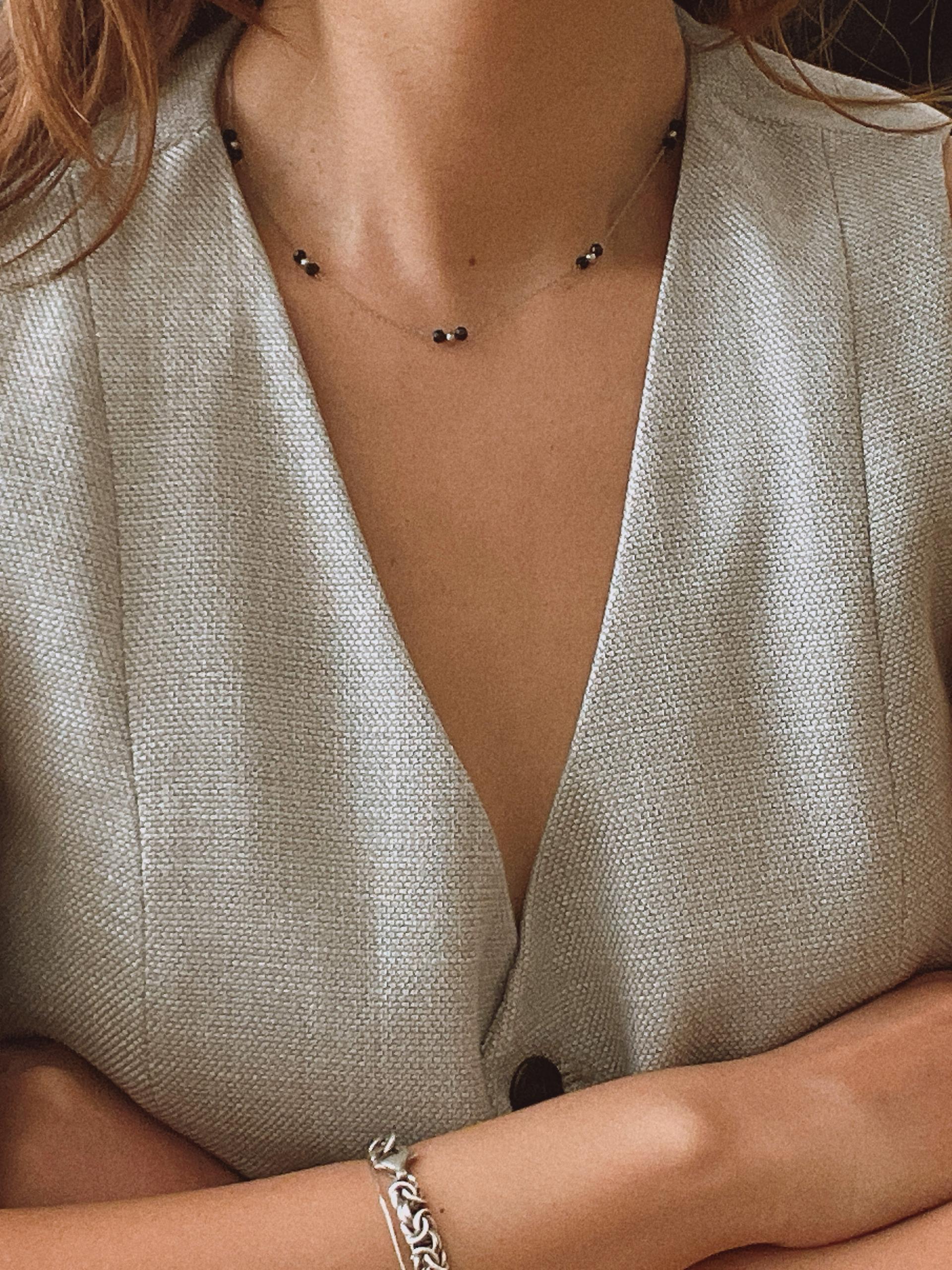 얇은 체인과 블랙 비즈의 레이어드가 넥선을 더 가늘고