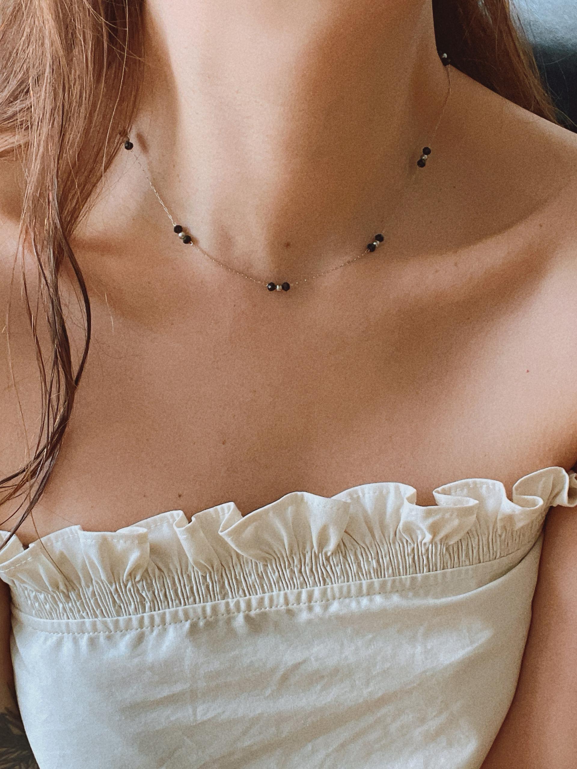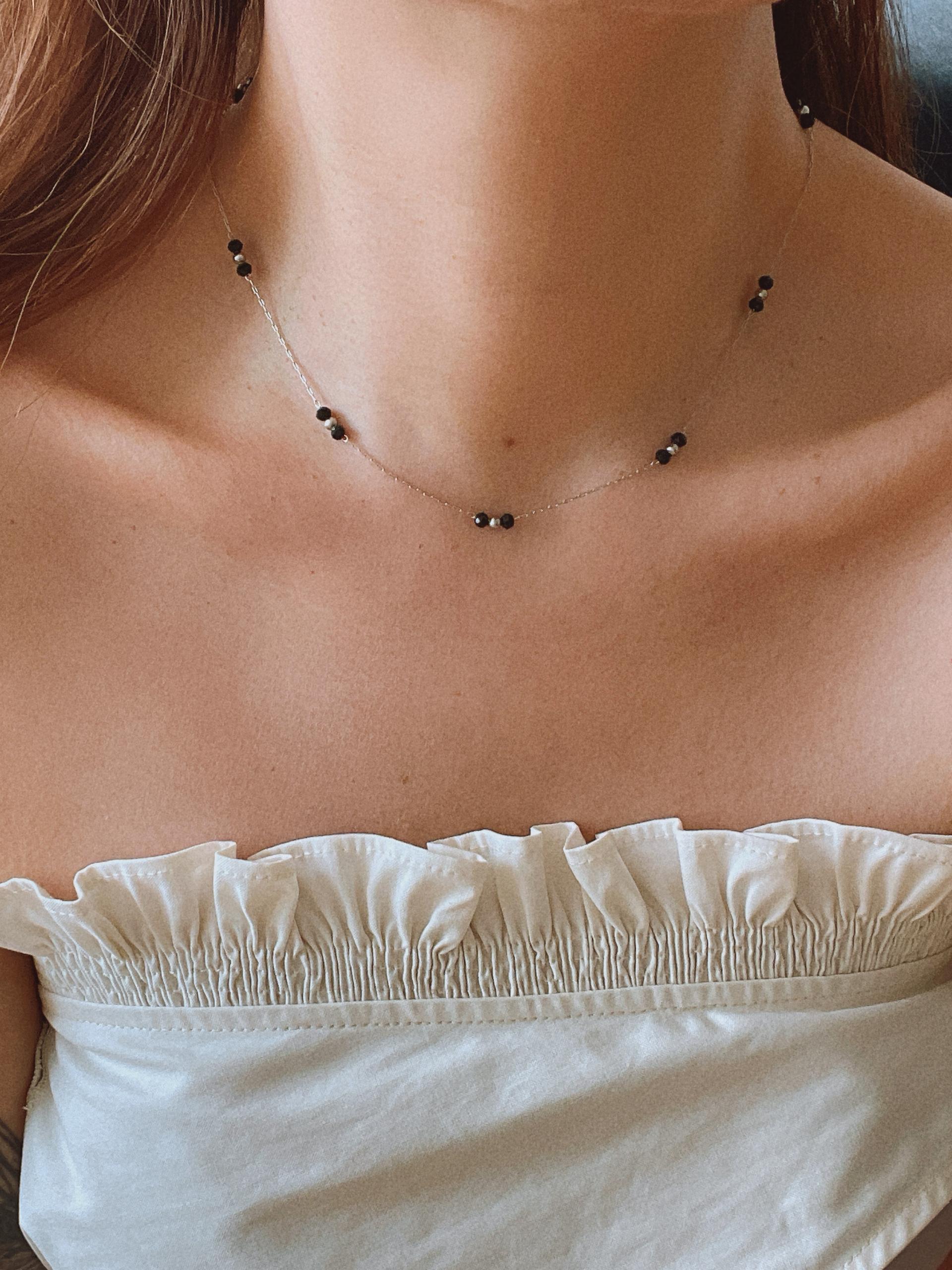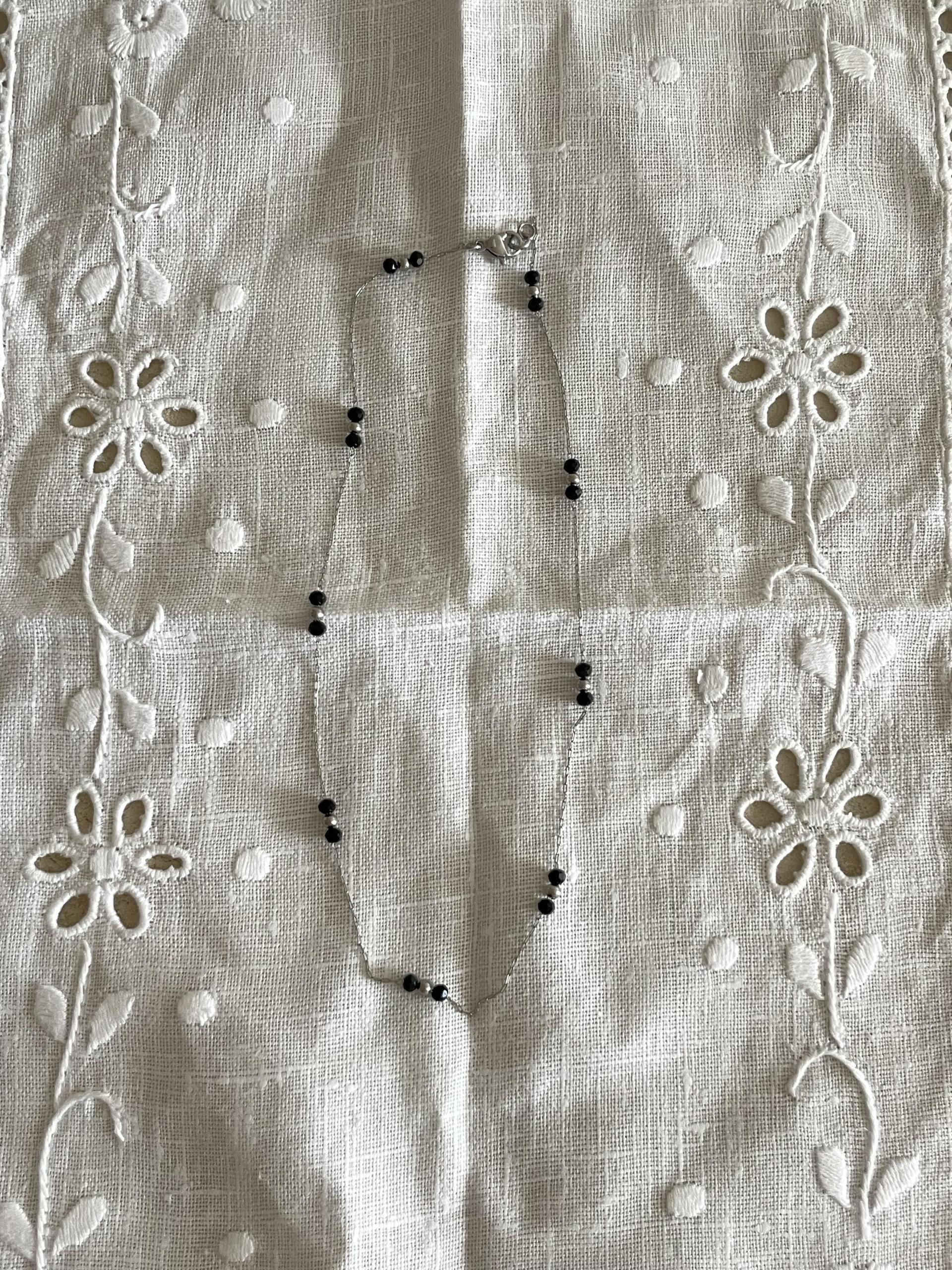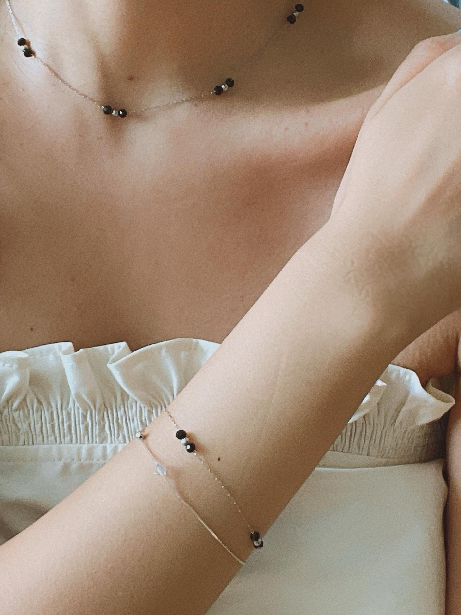 얇은 체인과 블랙 비즈의 레이어드가 넥선을 더 가늘고