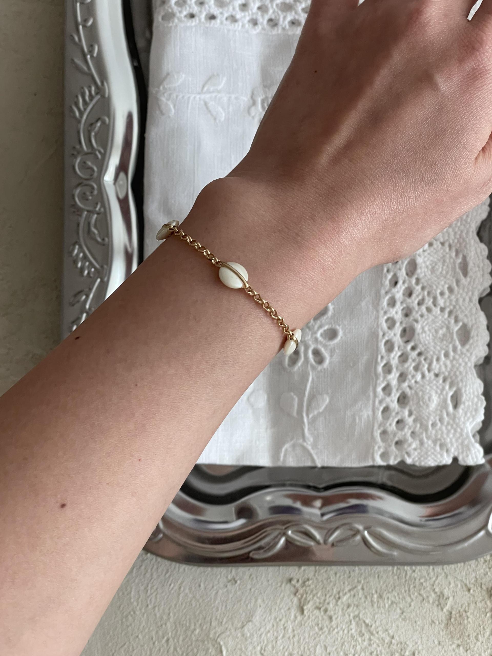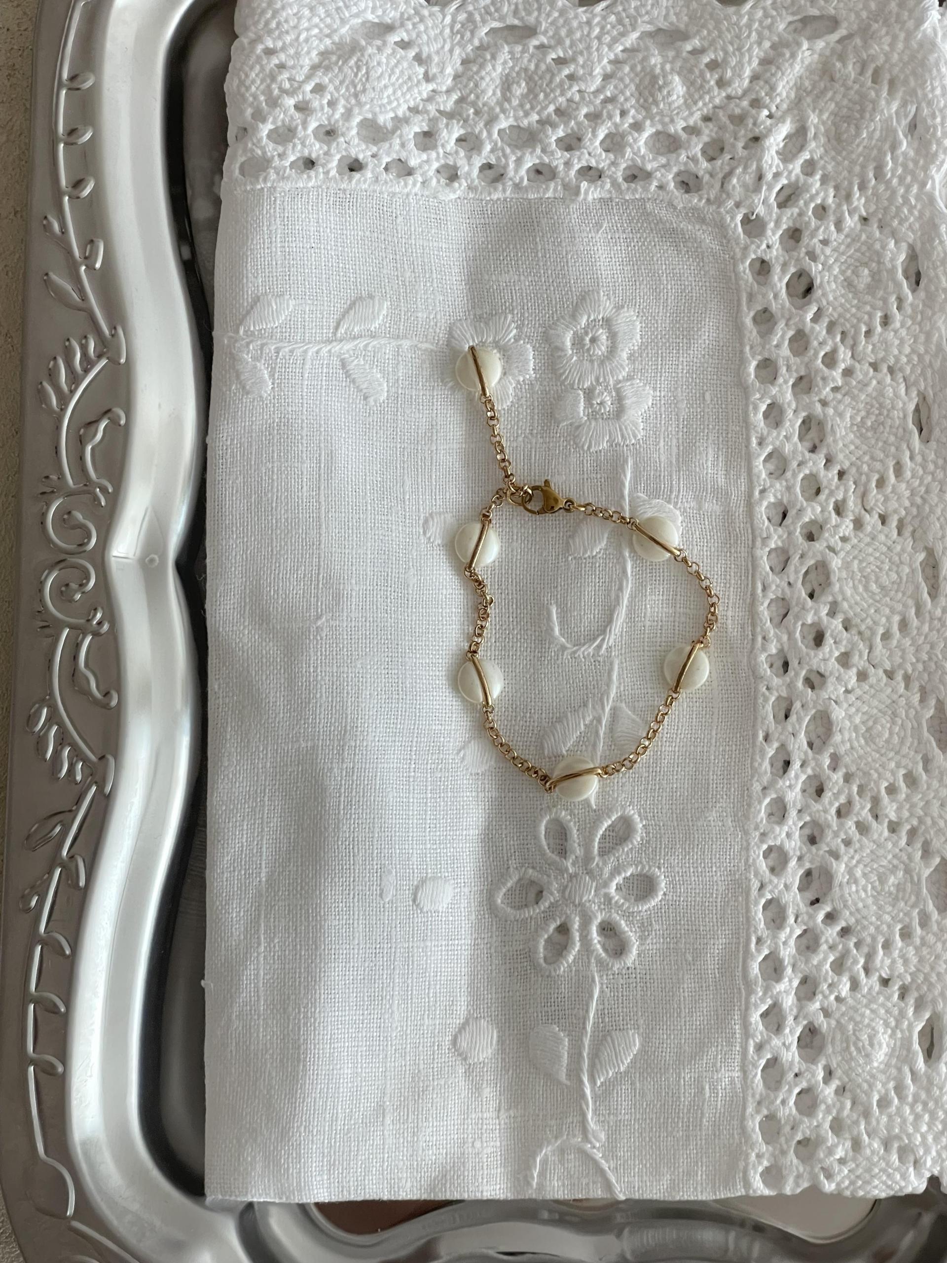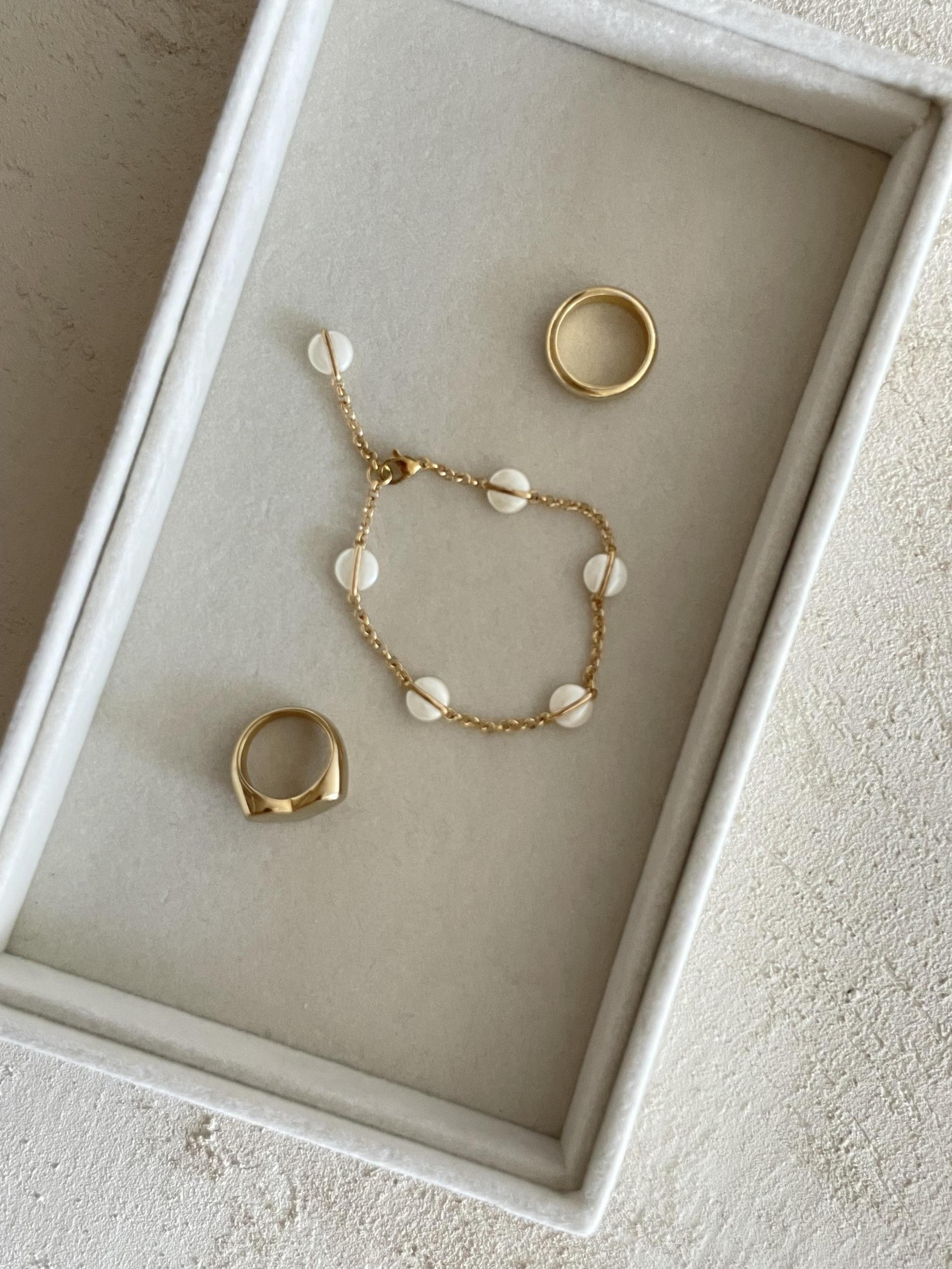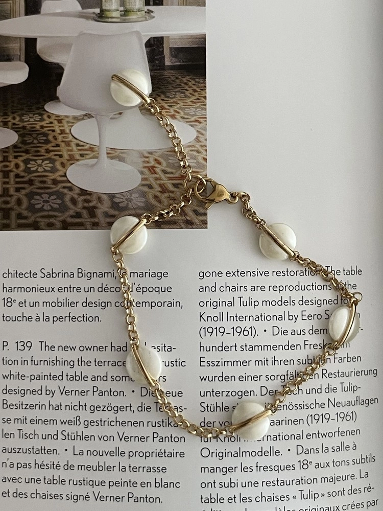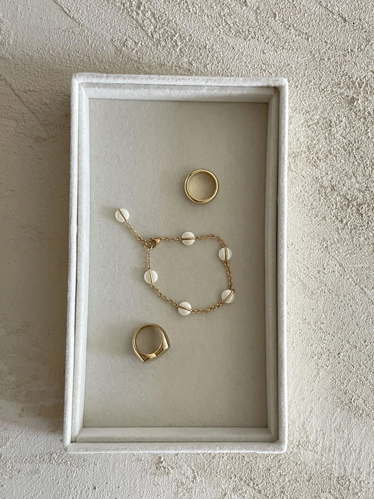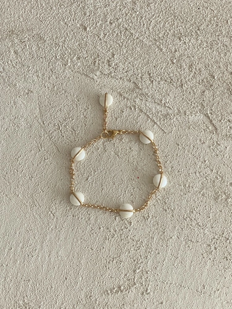 달빛처럼 오묘한 베이지 컬러의 팬던트가 돋보이는 팔찌 디자인으로 피부톤과 잘 어울리는 골드컬러 체인으로 분위기에 따라 연출해보세요.