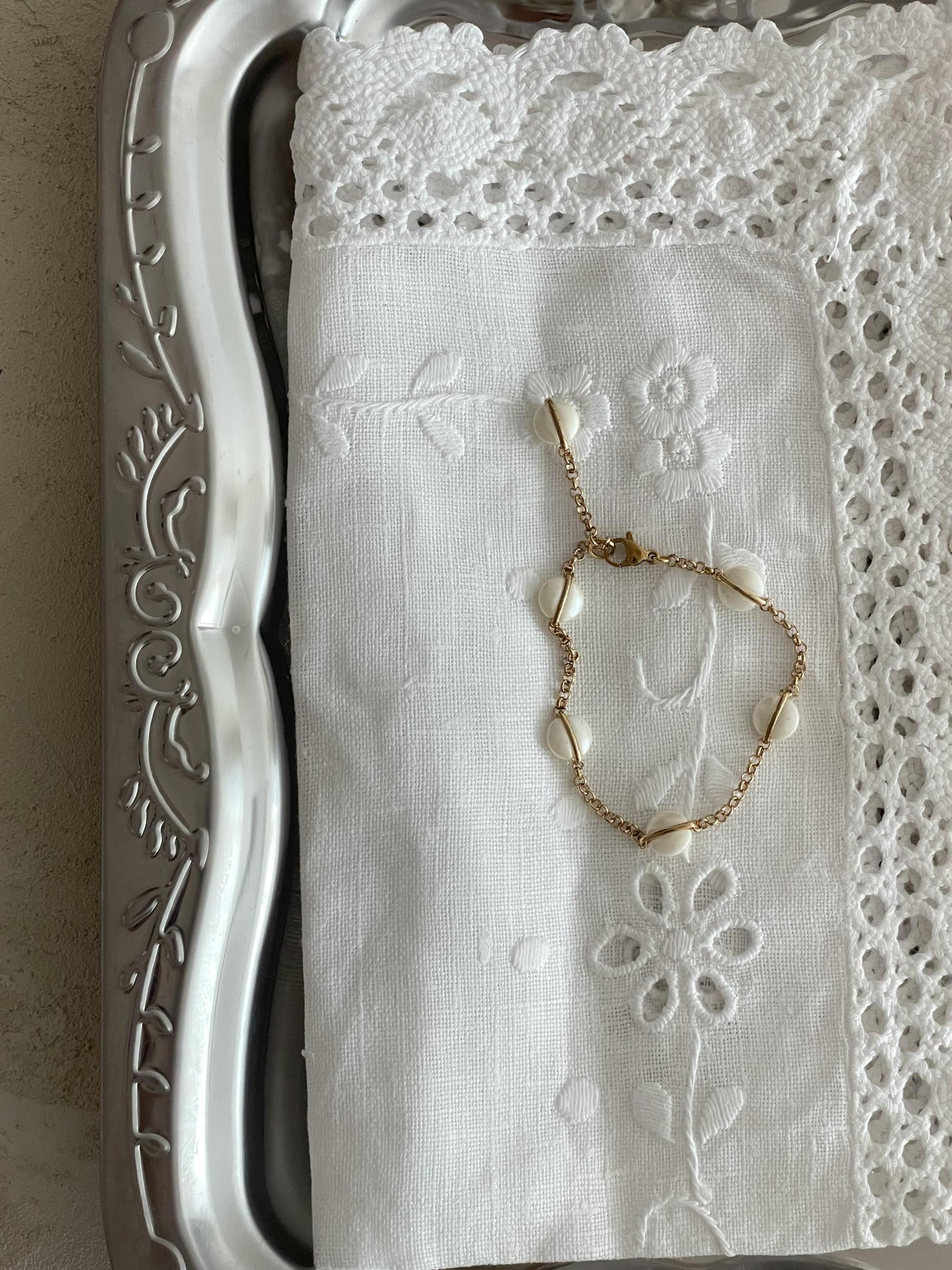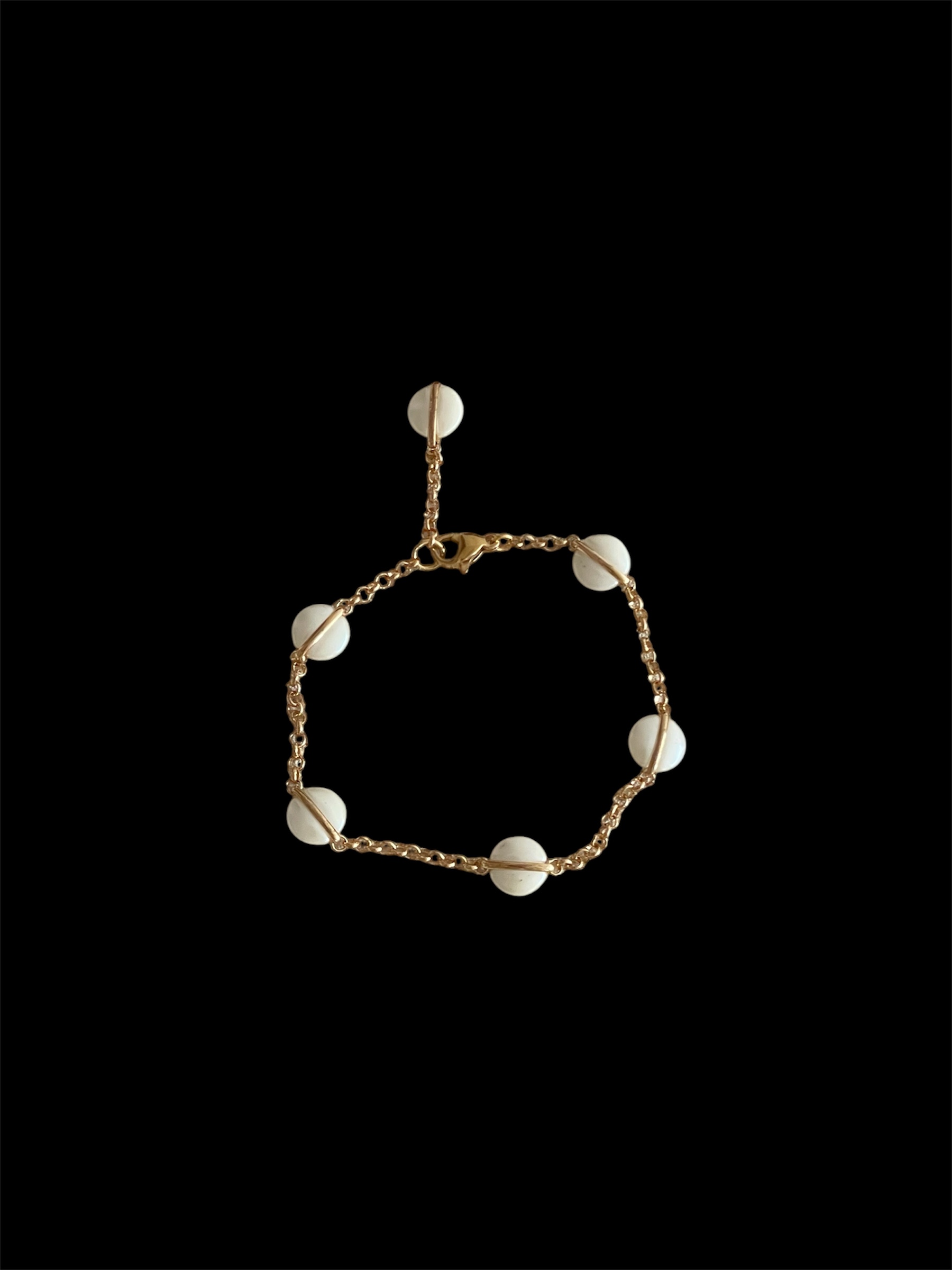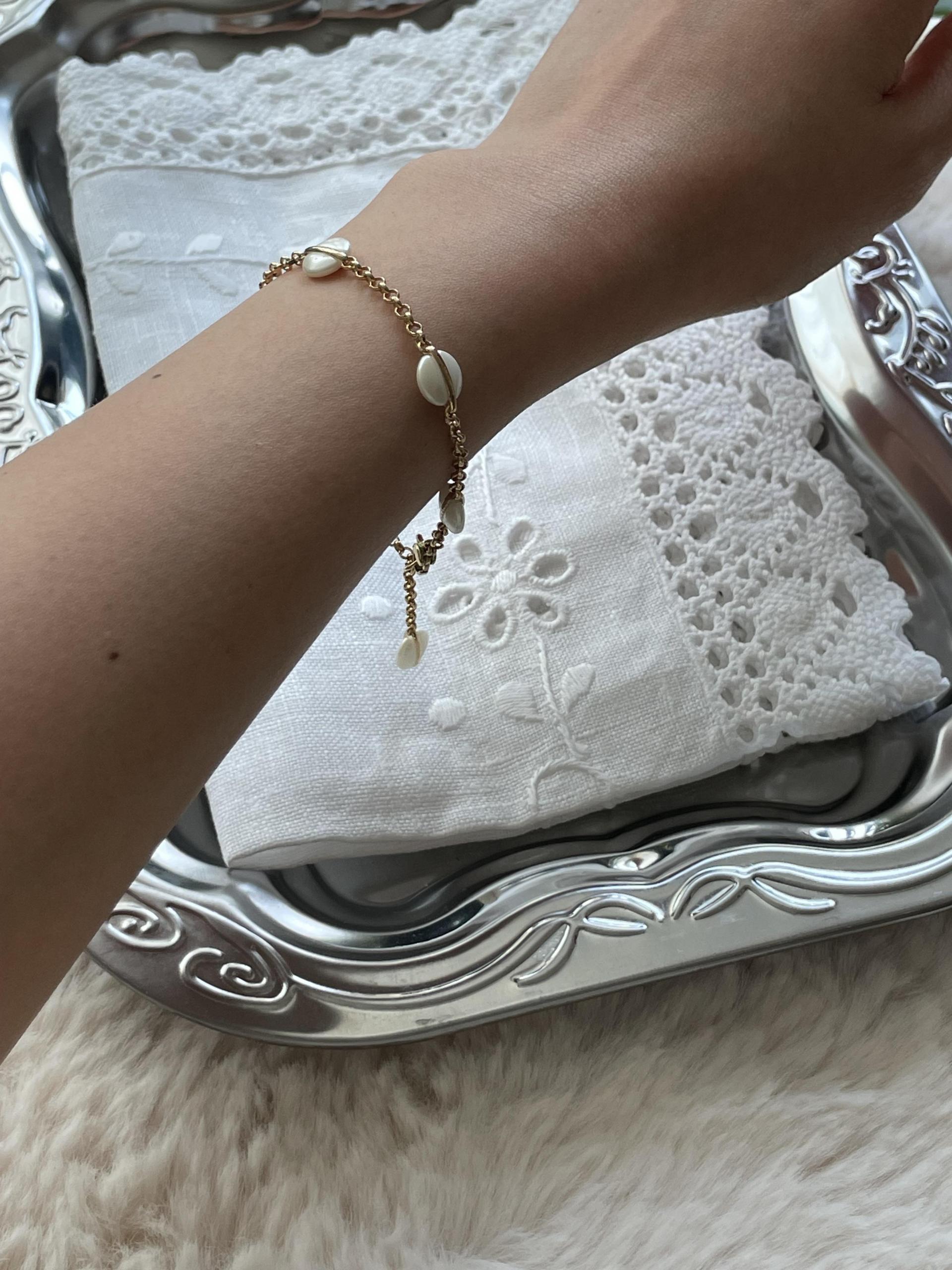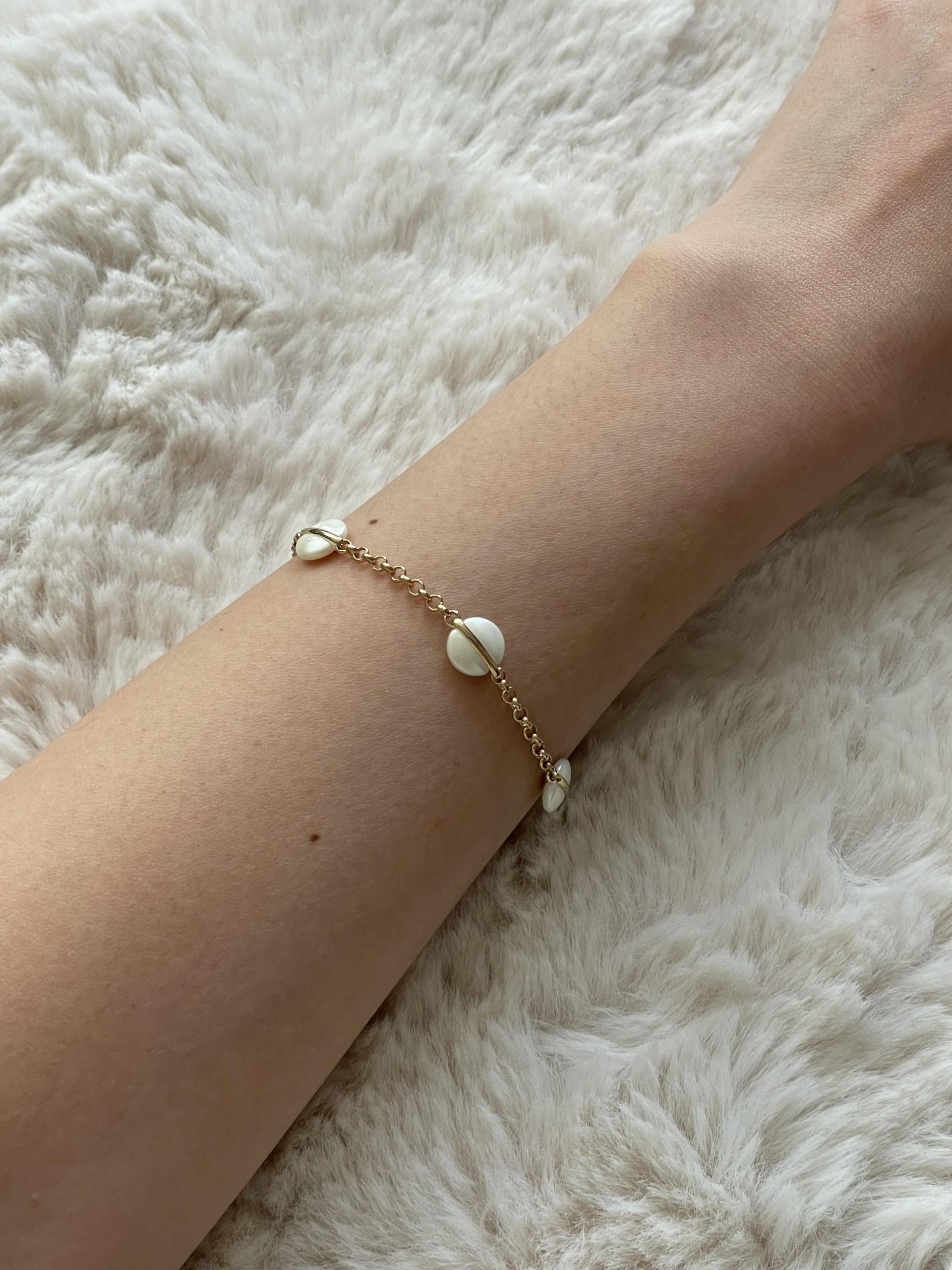 달빛처럼 오묘한 베이지 컬러의 팬던트가 돋보이는 팔찌 디자인으로 피부톤과 잘 어울리는 골드컬러 체인으로 분위기에 따라 연출해보세요.